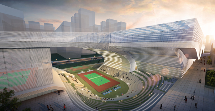 寶安體育中心云館位于深圳市寶安區(qū)體育中心地塊內,東側臨體育中心綜合訓練館,南鄰體育中心游泳場館,西臨體育館,北鄰羅田路。項目總用地面積21000㎡,總建筑面積60600㎡,地上3層,限高24m。要求其功能設置需要擁有室外網球場,并且可滿足國家級比賽要求,并配有其它多功能體育館。