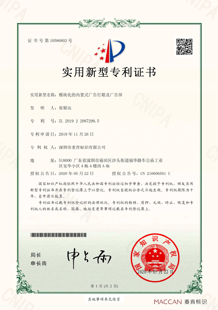 近日,麥肯標識申請的中洲濱海商業(yè)中心410㎡燈箱廣告“模塊化的內(nèi)置式廣告燈箱及廣告屏”得到國家知識產(chǎn)權(quán)局認證,榮獲“實用新型專利證書”。