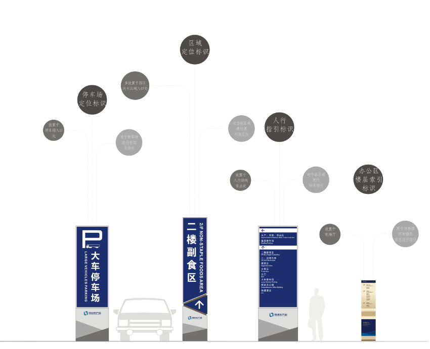 以藍(lán)白色為主調(diào),很符合工業(yè)園區(qū)環(huán)保簡(jiǎn)潔氛圍,整體系統(tǒng)簡(jiǎn)潔大方。將其功能性發(fā)揮到最大化。在直觀明了的導(dǎo)視牌面輔以三維化導(dǎo)視牌,讓路癡的你也有了方向感。