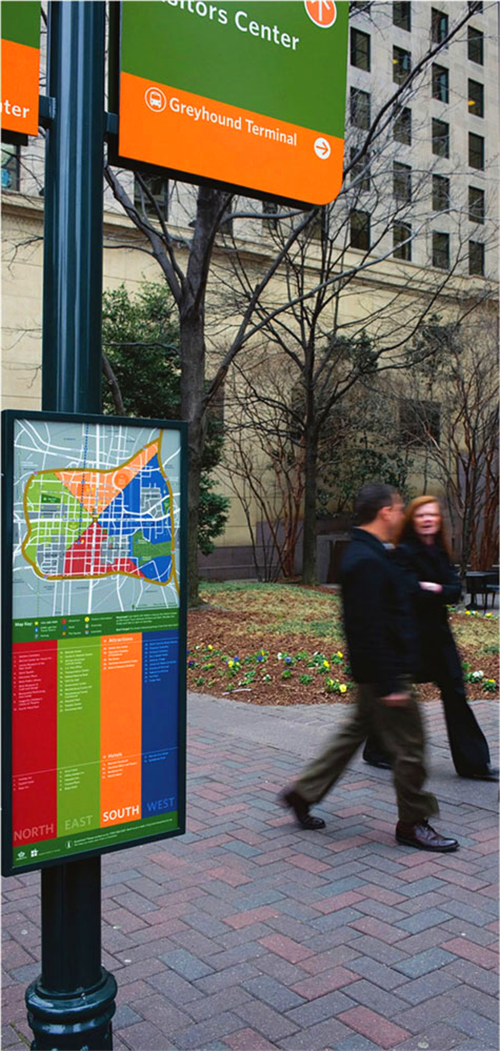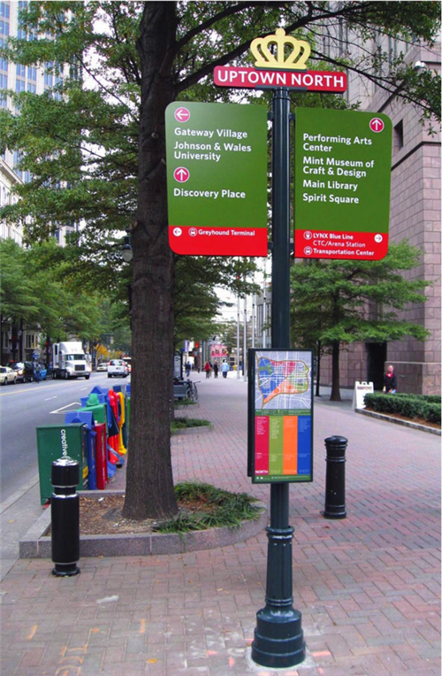 Two Twelve設計工作室與夏洛特當?shù)氐捻椖亢献骰锇锽rinkley Design設計工作室一起,進行夏洛特市城區(qū)的城市公共導視系統(tǒng)的設計工作。