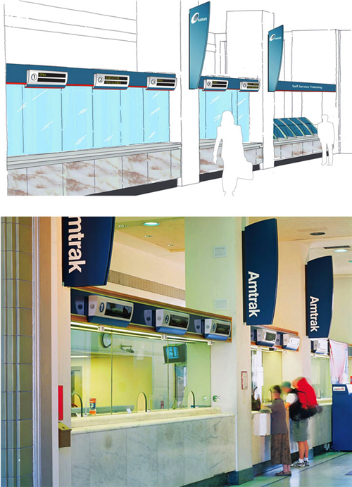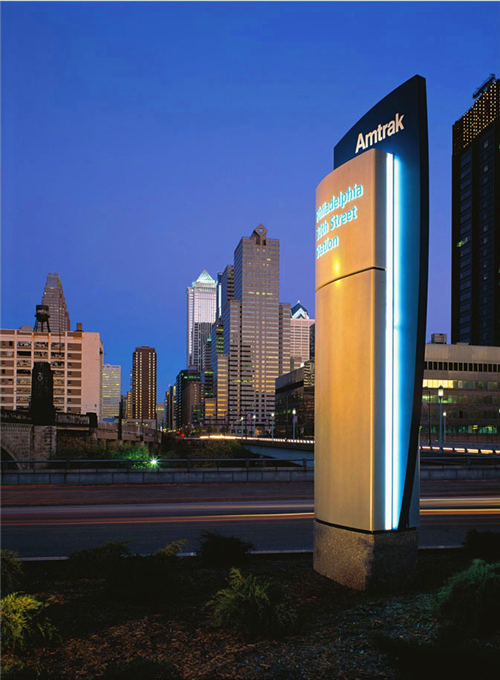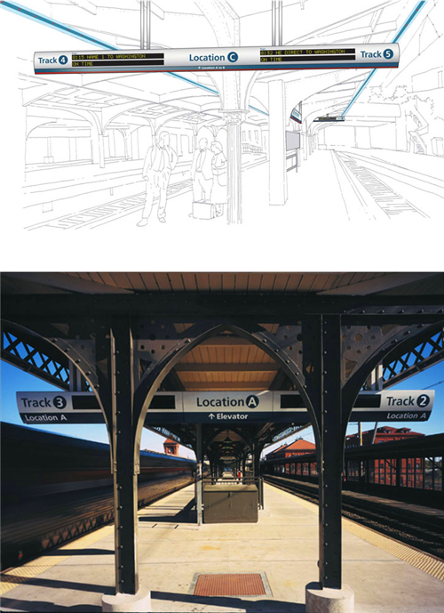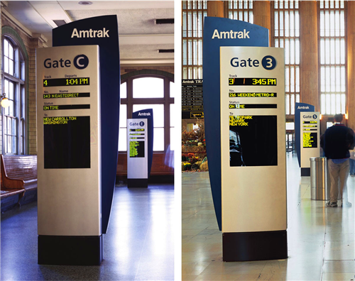C&VE工作室為阿西樂車站設(shè)計了一套導(dǎo)視系統(tǒng),將該導(dǎo)視系統(tǒng)作為Amtrak的高速運(yùn)營服務(wù)品牌,并打造了一個具有凸顯品牌特色的形象。通過對旅客在使用Amtrak服務(wù)之后的調(diào)查表明,從站外買票,進(jìn)入大廳,再到月臺的整個過程,這套導(dǎo)視系統(tǒng)都發(fā)揮了其應(yīng)有的作用。