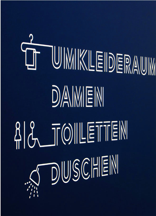 導視系統(tǒng)中最出眾的設(shè)計就是對字母的改造,將字母做一個設(shè)計的斷層,讓這個空間帶有運動的干練、直爽感,線條表達讓字體與圖案相結(jié)合,讓人感覺到運動的快樂。