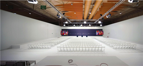 P-06 ATELIER設(shè)計工作室與建筑師RISCO等合作。整個會場的面積有35000平方米,可以憑借出色的導視系統(tǒng)讓上千成萬的與會人員實現(xiàn)自由活動的目的。鮮艷色彩的選擇讓整個空間給人一種寬敞、簡捷的秩序感。在人行過道的地板上和主要通道中,白色的字體配以黑色的地板。在會議中心的人行道地板上同樣將大型圖案作為背景,天花板上那螺旋上升的圓形板是設(shè)計的最大亮點。