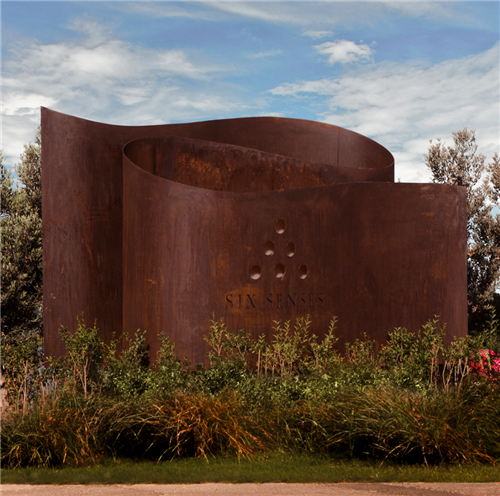基于酒店名Six Senses,F(xiàn)ederation設(shè)計(jì)機(jī)構(gòu)設(shè)計(jì)了六個(gè)簡約的不規(guī)則圓點(diǎn)logo,象征著六種感覺。精神堡壘為流暢的立體折面,在內(nèi)部設(shè)計(jì)了藍(lán)色的氛圍燈光,具有神秘感。戶外立式導(dǎo)視板由不規(guī)則木材和石材結(jié)合,擁有彎曲的線條,特別的是,在連接處設(shè)計(jì)了燈光照明,具有裝飾作用。室內(nèi)采用較厚的圓角方形木材和石材相結(jié)合,具有厚重感,配色溫和,打造了優(yōu)雅的酒店環(huán)境。