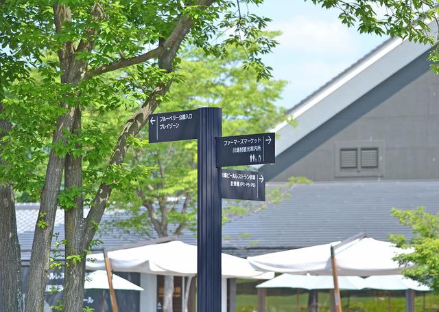 川場(chǎng)村,是位于日本群馬縣一個(gè)小型旅游景點(diǎn),景色優(yōu)美,溫度適宜,很受游客歡迎,每年有大致120萬游客到訪。因?yàn)轭A(yù)算有限,設(shè)計(jì)師采用了價(jià)格低廉的瓦楞板來做標(biāo)識(shí)牌。金屬瓦楞板耐腐蝕,而且材料可以讓人很容易聯(lián)想到自然和“耕作”,和川場(chǎng)村大量依賴農(nóng)業(yè)經(jīng)濟(jì)的實(shí)際情況相符合。但是瓦楞板的波浪形表面,導(dǎo)致直接寫在瓦楞板上的內(nèi)容很難別識(shí)別,需要經(jīng)過設(shè)計(jì)處理,讓標(biāo)識(shí)顯得有節(jié)奏感。