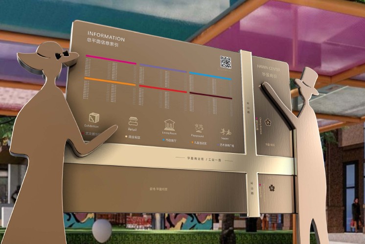 導(dǎo)視設(shè)計(jì)里的“華先生”,整體形態(tài)采用較為夸張的藝術(shù)手法,略去了五官輪廓,手腳形態(tài)抽象化,體態(tài)圓潤(rùn)化,有時(shí)較為夸張的動(dòng)態(tài)姿勢(shì),在空間中表現(xiàn)更具親和力。在華盈里享受生活的同時(shí),導(dǎo)視牌也不再局限于指引的功能,每一件導(dǎo)視作品都如一件藝術(shù)品,與人產(chǎn)生了共鳴。