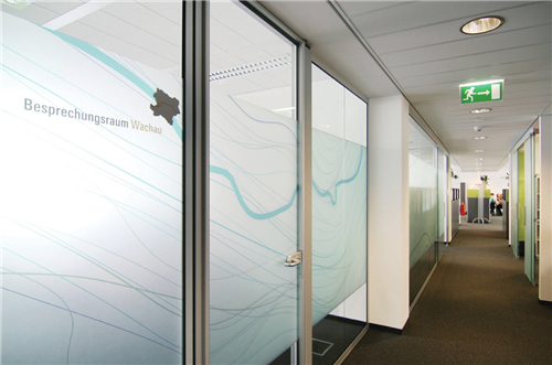 企業(yè)藍色線狀結(jié)構(gòu)的企業(yè)標(biāo)識從墻壁遍布到門上,這種有設(shè)計美感的象形圖都讓品牌文化增色不少。(來源:全球經(jīng)典標(biāo)識與導(dǎo)視設(shè)計)