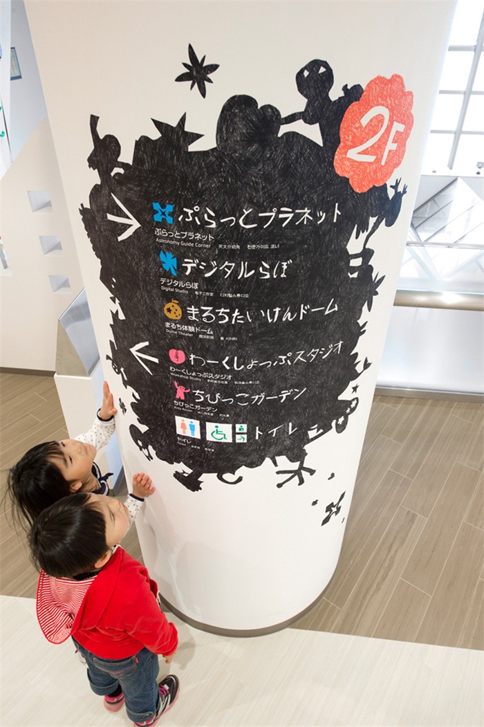 日本足立區(qū)享有盛譽(yù)的兒童未來(lái)創(chuàng)造館,擁有無(wú)數(shù)不同年齡段孩子可以體驗(yàn)的玩樂(lè)設(shè)施,還有國(guó)內(nèi)最大的3層網(wǎng)編空間,1歲的孩子開(kāi)始就能夠在里面自由行走爬行。在這里你還能進(jìn)行一場(chǎng)“神秘宇宙奇妙之旅”,通過(guò)體驗(yàn)式互動(dòng)交流和觀看SGI數(shù)字宇宙劇探索廣袤宇宙,玩轉(zhuǎn)星空,掌握科學(xué)文化知識(shí)。標(biāo)識(shí)設(shè)計(jì)中采用了宇宙探索之旅的元素,利用插畫(huà)、動(dòng)畫(huà)的形式來(lái)傳達(dá)有趣的空間狀態(tài),孩子們通過(guò)富有想象力的視覺(jué)元素,沉浸于其中的游樂(lè)氛圍。此時(shí)標(biāo)識(shí)設(shè)計(jì)起到畫(huà)龍點(diǎn)睛,帶來(lái)二次創(chuàng)造的作用!