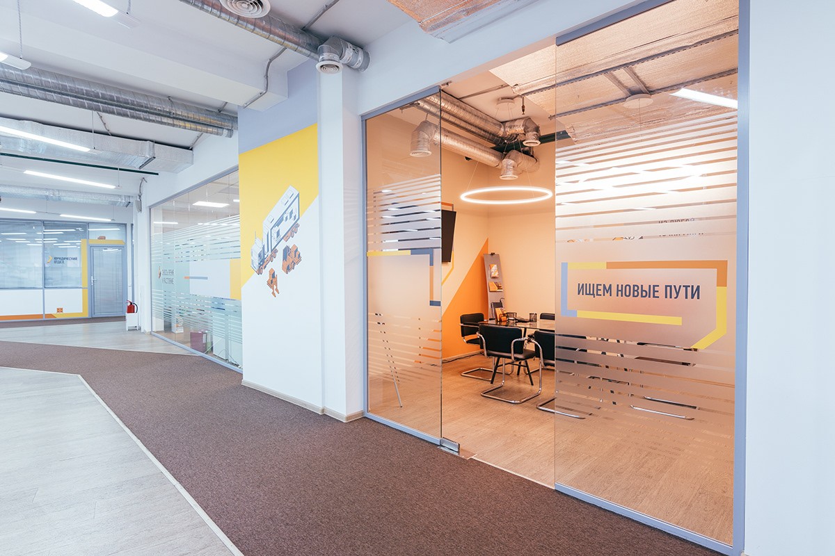 Sergey Scoler為其設(shè)計(jì)了飛機(jī)、物流倉(cāng)儲(chǔ)等環(huán)境圖形,與公司業(yè)務(wù)相契合。采用黃色、橙色、灰色和黑色的配色,打造了具有活力的辦公環(huán)境。多變的色塊遍布整個(gè)辦公空間,寓意著克服困難。