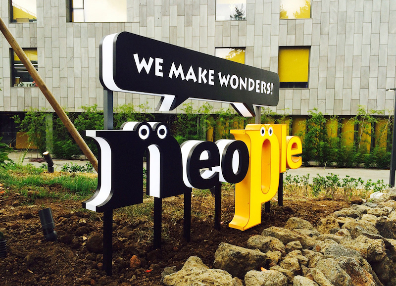 基于Neople公司的精神,Jade Son將標(biāo)語(yǔ)”We make wonders ”用對(duì)話框的形式融入logo中,logo中加入了兩小眼睛,看起來(lái)就像是兩個(gè)小人說(shuō)出標(biāo)語(yǔ)的感覺(jué),充滿了奇趣感。采用鮮明的黃色和沉穩(wěn)的黑色,部分標(biāo)牌將icon和文字融合在一起,趣味性較強(qiáng)。將走廊設(shè)計(jì)成公路,讓人們體驗(yàn)到尋路的樂(lè)趣。