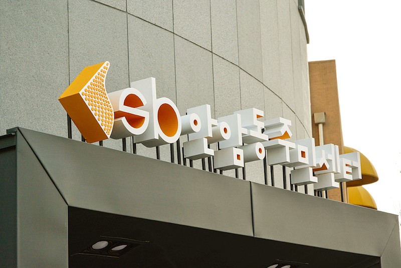Everyday practice根據(jù)居民中心的裝修風(fēng)格,設(shè)計(jì)了簡(jiǎn)潔的導(dǎo)視系統(tǒng),字體設(shè)計(jì)較為現(xiàn)代化,使用無(wú)襯線字體,信息易于辨識(shí)。使用橙黃色作為主色調(diào),使辦公氛圍活潑,突出指示信息。在大門入口旁配備了立式信息導(dǎo)視牌,用作公告欄和地圖指示。