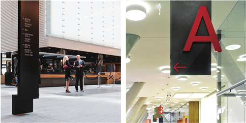 與公共空間導(dǎo)視系統(tǒng)不同的是,商業(yè)環(huán)境導(dǎo)視系統(tǒng)的利用空間都比較開闊,例如,商場(chǎng)、酒店與辦公寫字樓等。商業(yè)環(huán)境導(dǎo)視系統(tǒng)的設(shè)置更多安排在關(guān)鍵的指示區(qū)域,在大廳的主入口處、主要入口和通道、建筑物主體的入口正上方、室外扶梯客梯、中庭的邊緣位置、櫥窗與玻璃門、樓層的各個(gè)主次出入口等。