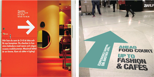 商業(yè)環(huán)境導(dǎo)視系統(tǒng)主要集中在室內(nèi)設(shè)計(jì)方面,而室外主要集中在戶外建筑物外墻的整體識(shí)別、進(jìn)出口的交通標(biāo)識(shí)牌、落地式的系統(tǒng)標(biāo)識(shí)牌,以及一些立地式的宣傳欄等;商業(yè)環(huán)境導(dǎo)視系統(tǒng)室內(nèi)設(shè)計(jì)主要分為功能指示牌和信息標(biāo)識(shí)牌兩種,將品牌推廣信息更多地植入于信息標(biāo)識(shí)牌。這些標(biāo)識(shí)牌在傳遞信息的同時(shí),通過品牌顏色和品牌標(biāo)識(shí)使受眾加深對(duì)該品牌的記憶,與戶外設(shè)計(jì)對(duì)品牌的影響力相比,室內(nèi)設(shè)計(jì)的標(biāo)識(shí)牌對(duì)于品牌宣傳的作用比較明顯。