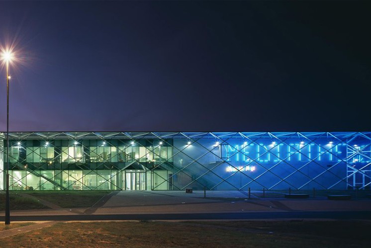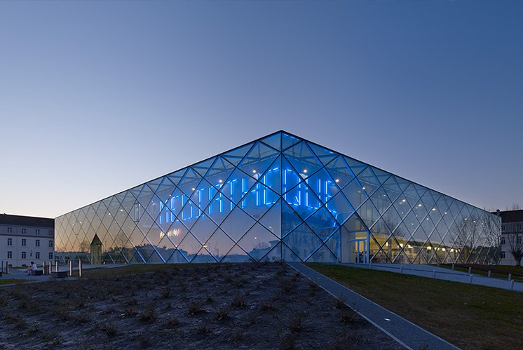 Jér?me Mignot在設(shè)計(jì)中巧妙地利用了發(fā)光字和藍(lán)色燈光,設(shè)計(jì)元素夜間尤為醒目,為圖書館的外觀增添了一抹未來感與科學(xué)氛圍感。線段式信息設(shè)計(jì),靈感直接來源于建筑的外觀,通過強(qiáng)調(diào)線條的結(jié)構(gòu)美,使得內(nèi)部信息的呈現(xiàn)既清晰又具有藝術(shù)感。此外,地庫的黑白配色設(shè)計(jì),簡約而不失格調(diào),為整個空間營造了一致性和整體性。