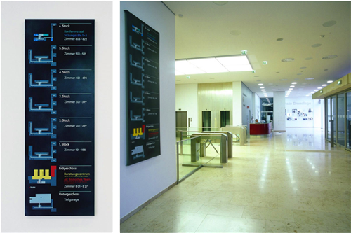 在大樓的導(dǎo)視系統(tǒng)中,另外一個(gè)很重要的特點(diǎn)就是在現(xiàn)代的設(shè)計(jì)中,仍能體現(xiàn)出大樓的歷史特點(diǎn),這些體現(xiàn)在對(duì)AK大樓特別選用的材料及字體設(shè)計(jì)。整個(gè)系統(tǒng)的Soleil字體包括符號(hào)和大小寫字母等都是與專業(yè)字體設(shè)計(jì)師Wolfgang Homola合作的設(shè)計(jì)作品。