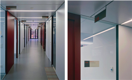 在咨詢室旁的走廊上,一進(jìn)門就可以看到一個(gè)用玻璃橫梁懸掛的大型立體字母,代表著不同功能的分區(qū)。