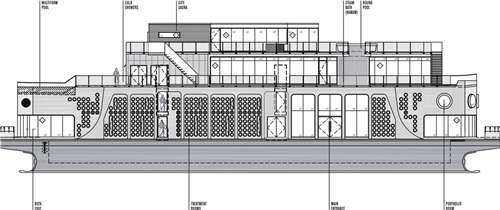 Sid Lee建筑設(shè)計(jì)工作室被委托作為Bota Bota的建筑和圖形的設(shè)計(jì)機(jī)構(gòu),要在傳統(tǒng)市區(qū)里設(shè)計(jì)一座具有現(xiàn)代感的復(fù)式水療中心。