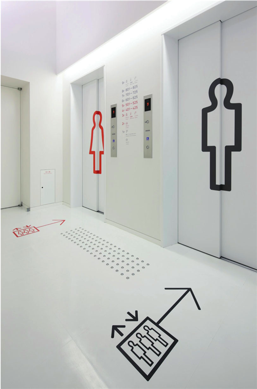 平面設(shè)計(jì)師、室內(nèi)設(shè)計(jì)師和產(chǎn)品設(shè)計(jì)師在設(shè)計(jì)前期經(jīng)過(guò)不斷地討論和研究,通過(guò)分享不同設(shè)計(jì)領(lǐng)域的設(shè)計(jì)理念,最終讓想法變成現(xiàn)實(shí)。就導(dǎo)視系統(tǒng)而言,墻體上和地板上的圖示符號(hào)清晰、明了地指明不同設(shè)施的位置,對(duì)于不同語(yǔ)言的外國(guó)游客同樣適用。