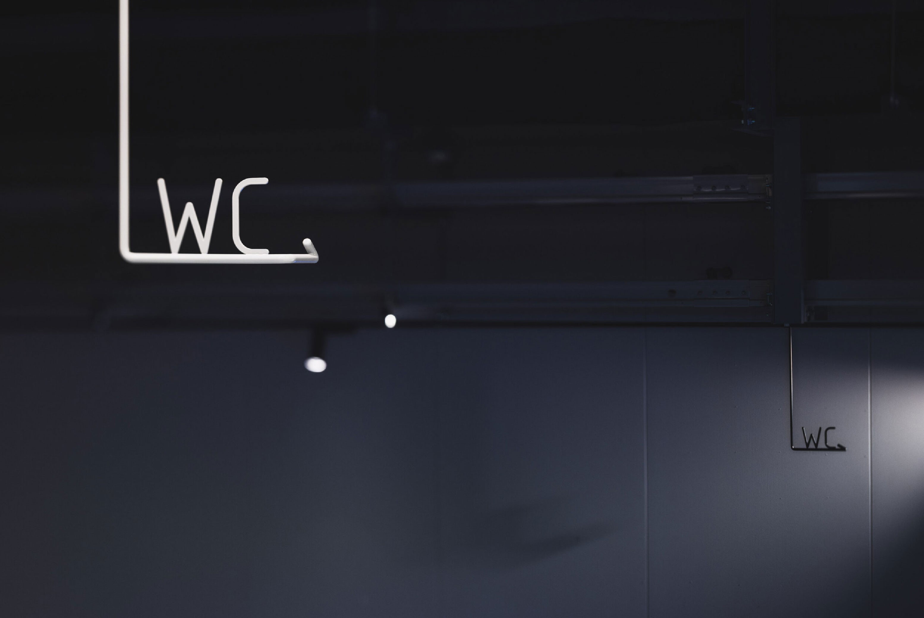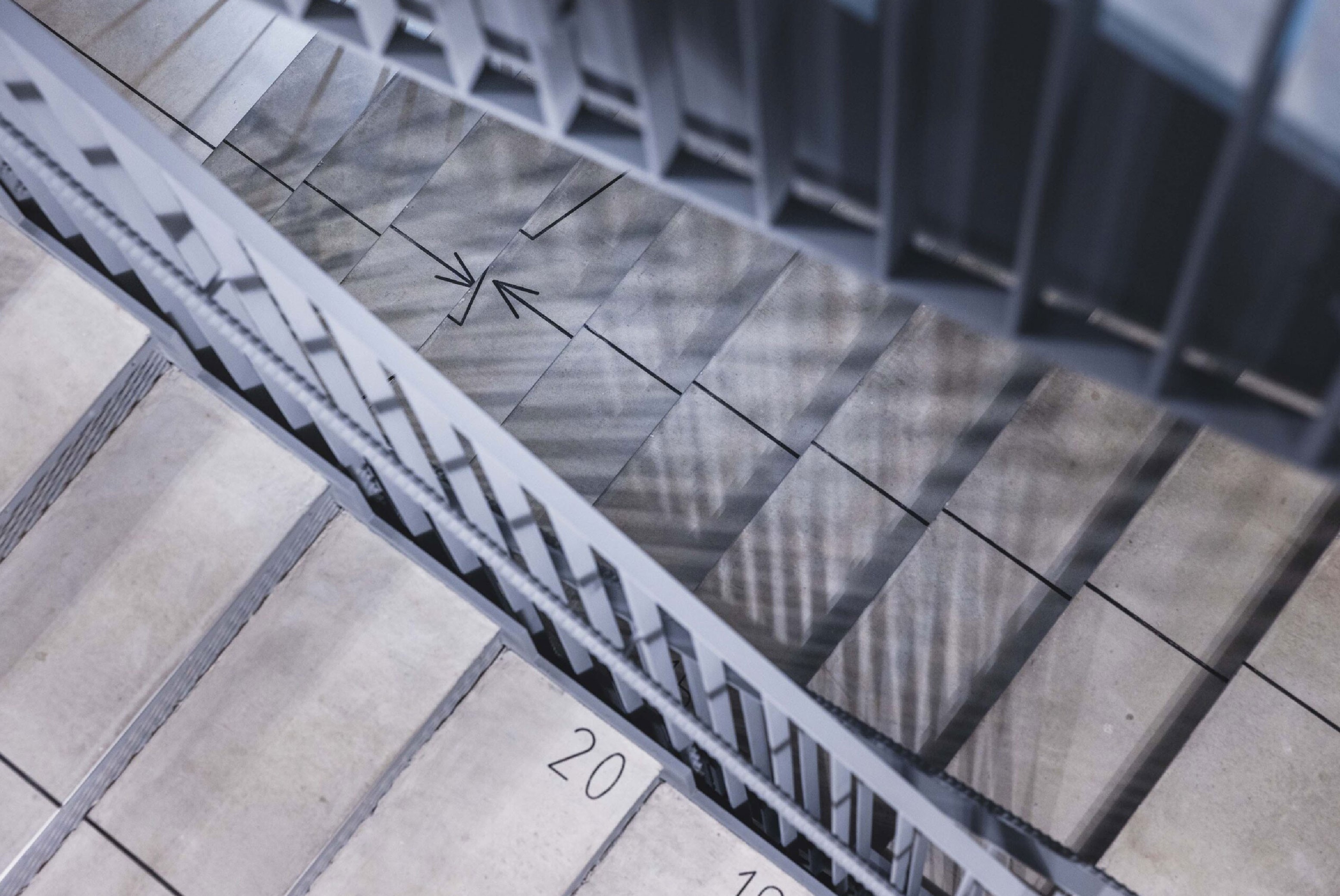 深入建筑內(nèi)部,標(biāo)識系統(tǒng)呈現(xiàn)出一種高度克制的現(xiàn)代美學(xué),每一處設(shè)計(jì)都服務(wù)于效率。樓梯區(qū)域的導(dǎo)視設(shè)計(jì)堪稱這一理念的縮影:僅使用最簡潔的直線箭頭與清晰的無襯線數(shù)字組合,摒棄了一切冗余裝飾。這種對空間效率的極致追求,貫穿于系統(tǒng)的每一個細(xì)節(jié)之中。尤為突破性的設(shè)計(jì)體現(xiàn)在地面導(dǎo)引系統(tǒng)上。項(xiàng)目徹底顛覆了傳統(tǒng)的懸掛或墻面指示牌形式,將精煉的黑色指示線與方向箭頭直接、無縫地融入地面鋪裝材質(zhì),使得科研人員在行進(jìn)過程中,視線無需刻意上抬即可輕松確認(rèn)方位與路徑。