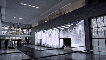 再來(lái)看看這塊屏幕有多神奇。一塊屏幕斜在建筑內(nèi),透過(guò)建筑外立面的玻璃你就能感受到不一樣的VR體驗(yàn)。