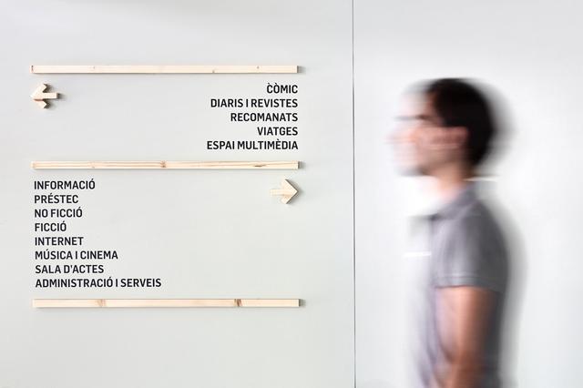Montbau圖書館是一個小型的社區(qū)圖書館,圖書館經(jīng)過重新裝飾和擴展,繼而開發(fā)了一套新的標識導(dǎo)視系統(tǒng)。圖書館標識導(dǎo)視的設(shè)計除了要求在風(fēng)格上要求與建筑統(tǒng)一,選擇干凈的排版和木材結(jié)合,三層不同木板的疊加營造不一樣的感覺,保持溫暖、溫馨和舒適的感覺。