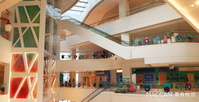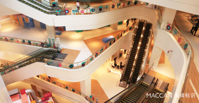 麥肯利用導視信息的碎片平面和合理分配,增加簡潔時尚的設計圖案,將整個區(qū)域打造成了休閑放松、愜意漫步的購物空間,極大滿足了消費者的心理。
