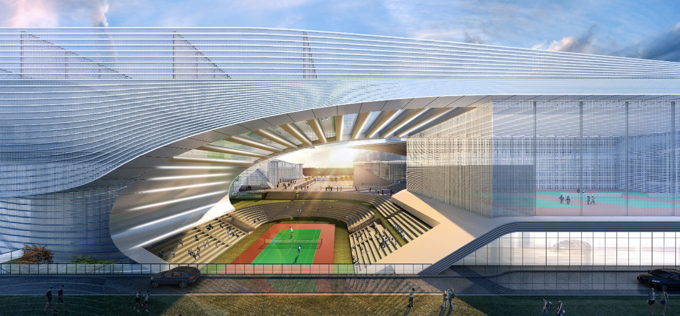 寶安體育中心云館位于深圳市寶安區(qū)體育中心地塊內,東側臨體育中心綜合訓練館,南鄰體育中心游泳場館,西臨體育館,北鄰羅田路。項目總用地面積21000㎡,總建筑面積60600㎡,地上3層,限高24m。要求其功能設置需要擁有室外網球場,并且可滿足國家級比賽要求,并配有其它多功能體育館。