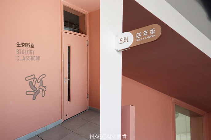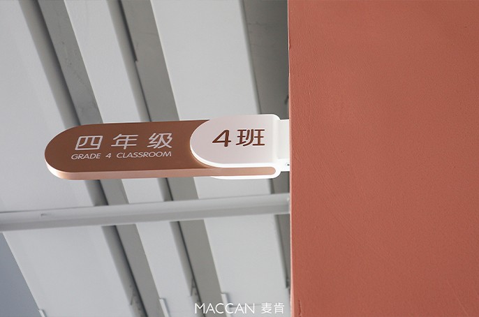 特立獨(dú)行的標(biāo)識符號美學(xué),極具向陽而生,充沛向上的積極能量。在校園巍峨屹立的建筑體上,彩虹顏色似的學(xué)校標(biāo)識,如奔放的旗幟與風(fēng)起舞,與莊嚴(yán)的石柱、拱廊相輝映,構(gòu)筑一幅夢幻童真的畫卷。校園墻面成為多元化、活躍、多彩的立體空間。