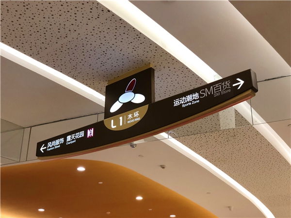 根據(jù)不同分區(qū)結(jié)合商場(chǎng)內(nèi)部室內(nèi)設(shè)計(jì)賦予每個(gè)區(qū)域的導(dǎo)視不同顏色,有星空燦爛之意。另外商場(chǎng)主體部分似盛開的花瓣,自然生態(tài)與高端科技融合,金屬材質(zhì)結(jié)合亞克力及燈光點(diǎn)綴做到標(biāo)識(shí)導(dǎo)視和諧醒目,打造一片璀璨星空。