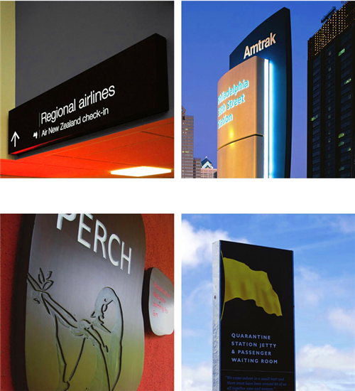 城市街區(qū)、公園、機場、車站等公共場所的普遍特征就是人流量巨大、活動范圍有限等,針對這些特殊的情況,導視系統(tǒng)就需要特定的設計手段和形式。公園是活動面積比較寬闊的公共場所,其導視系統(tǒng)設計對象主要是出入口和各個休息地點的指示標識,盡量做到標識設計與公共場所之間保持一種相互平衡的關(guān)系;機場是一個完全不能缺乏導視系統(tǒng)的公共空間,沒有完整和人性化設計導視系統(tǒng)的機場是不存在的。人流量大、功能區(qū)域眾多、活動范圍廣等特點,就決定了公共導視系統(tǒng)對機場的重要性;車站的占地面積是三者中最小的,這就要求導視系統(tǒng)的設計清晰、明確、簡捷。標志、顏色、招牌等都要在有限的空間里發(fā)揮到最大的作用。車站中的導視系統(tǒng)更需要在有限的時間和空間內(nèi)發(fā)揮到傳遞信息的重要作用。在不妨礙公共場所過多空間的前提下,公共的導視系統(tǒng)與空間的關(guān)系應該是有主次之分的,而空間是設計的主體,導視系統(tǒng)只是空間設計的輔助。