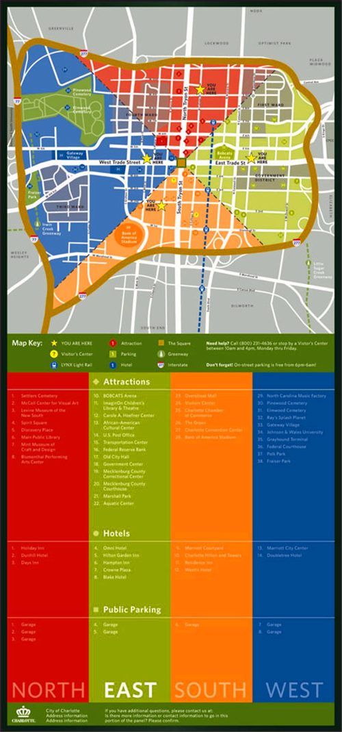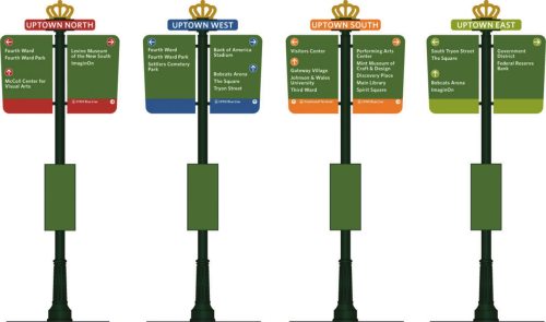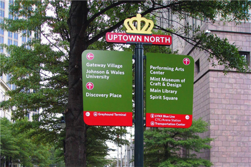 Two Twelve設計工作室與夏洛特當?shù)氐捻椖亢献骰锇锽rinkley Design設計工作室一起,進行夏洛特市城區(qū)的城市公共導視系統(tǒng)的設計工作。