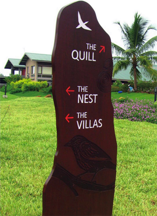 園林景觀是一個(gè)戶外開放型的公共空間,從基本特征來看,園林占地面積大、樹木的遮蔽性大、景點(diǎn)比較分散、環(huán)境的可識(shí)別性相對(duì)弱,游客迫切地需要一個(gè)導(dǎo)向明確而簡(jiǎn)捷的導(dǎo)視系統(tǒng)。園林景觀的導(dǎo)視系統(tǒng)主要有園林平面圖、場(chǎng)所方位指示和場(chǎng)所標(biāo)識(shí)、科普文化標(biāo)識(shí)、警示標(biāo)識(shí)等。有的公園還配備了導(dǎo)游手冊(cè),主要是將道路、景觀、場(chǎng)所一一標(biāo)注出來,只要你一進(jìn)入公園就可以將公園的結(jié)構(gòu)看得一清二楚。在設(shè)計(jì)時(shí)應(yīng)考慮既不能破壞園林整體氣氛,又可以達(dá)到引導(dǎo)、吸引游客的目的。由于范圍廣泛,園林的導(dǎo)視密度相對(duì)降低,體量感相對(duì)增大,而且導(dǎo)視系統(tǒng)設(shè)計(jì)風(fēng)格、色彩統(tǒng)一性,以及形式感都可以相對(duì)自由、新穎,給人深刻印象。