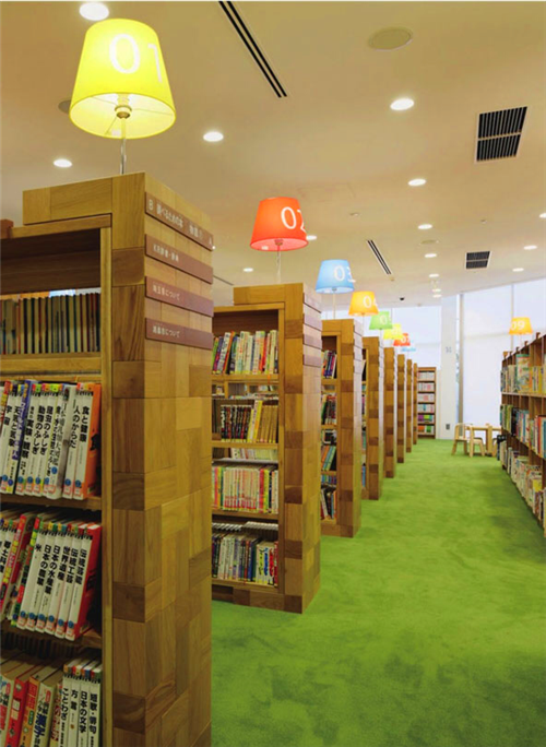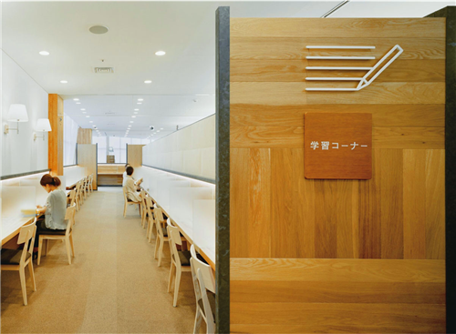 6D設(shè)計工作室受邀對2010年重新選址后的Kounosu中心圖書館進行室內(nèi)設(shè)計和導(dǎo)視系統(tǒng)設(shè)計的工作。他們的目標就是要改變?nèi)藗兤毡閷D書館的看法,營造一個令人感覺舒適而愉悅的空間,例如,選用木板來取代以往的人工材料,擺脫以往的刻板和嚴肅形象。