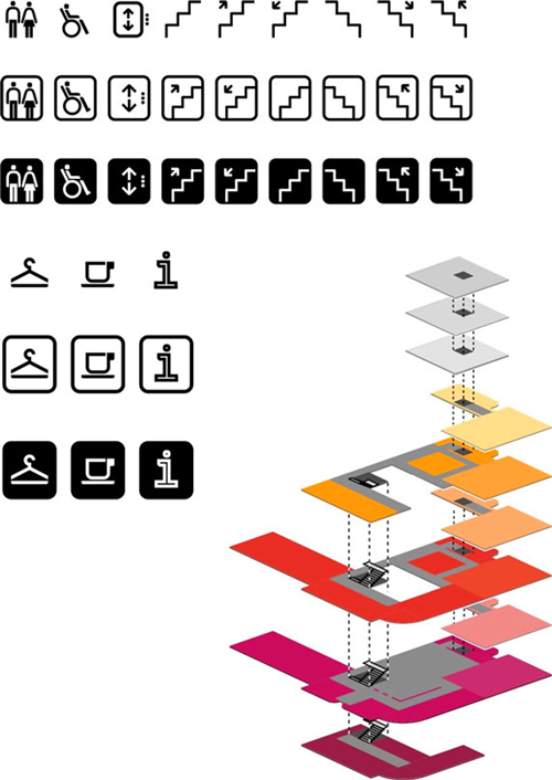 導(dǎo)視系統(tǒng)的設(shè)計在一定程度上展現(xiàn)了大樓的歷史底蘊,主要還是對以往的導(dǎo)視系統(tǒng)招牌做一個翻新和變革。字體的設(shè)計仿佛將人們帶回了那個熟悉的20世紀30年代。通過融合了antiqua和grotesque的字體設(shè)計之后,字體讓人感受到現(xiàn)代氣息的同時,仍透露出歷史的古老閱讀氛圍。