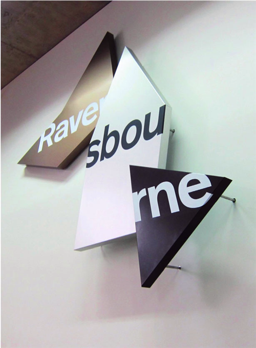 瑞文斯博藝術(shù)與傳播學(xué)院的建筑內(nèi)飾是錯(cuò)層式的20世紀(jì)60年代的停車場(chǎng)風(fēng)格,學(xué)院邀請(qǐng)了設(shè)計(jì)師Johnson Banks對(duì)室內(nèi)導(dǎo)視系統(tǒng)進(jìn)行設(shè)計(jì)指導(dǎo)。