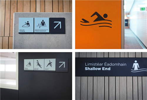 Detail.設(shè)計工作室為都柏林休閑中心設(shè)計了一套標識和導視系統(tǒng)。設(shè)計團隊還與設(shè)計師McGarry Ní éanaigh和建筑設(shè)計師Donnelly Turpin共同合作,設(shè)計一套人形的插畫標識。全套導視系統(tǒng)遍布了中心的各個角落。