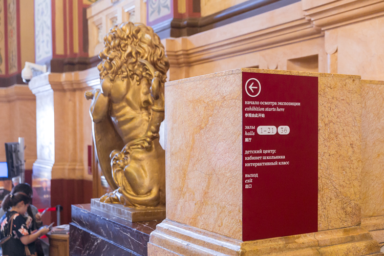 博物館每年訪問量超過150萬人,其中中國游客占很大一部分,為此Zoloto group為博物館制定了中俄英三種語言的導(dǎo)視系統(tǒng)。標牌系統(tǒng)以酒紅色為底色搭配白色文字和圖形符號,與古老的室內(nèi)裝飾搭配得宜突顯形式美感。清晰、簡單的設(shè)計能促使導(dǎo)向信息質(zhì)量的提高,為游客提供更便捷準確的指引。