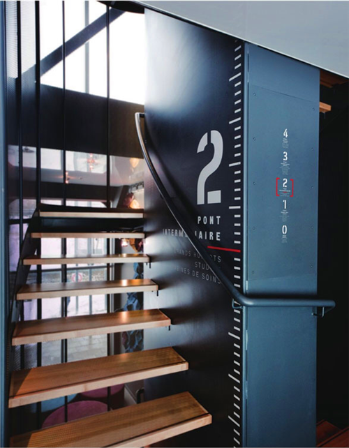 除了考慮到設(shè)計(jì)美感方面如何與建筑主體相呼應(yīng)以外,最重要的一個(gè)因素就是導(dǎo)視系統(tǒng)覆蓋的范圍,包括配備3部獨(dú)立電梯的13個(gè)樓層,以及采光通風(fēng)的中庭。