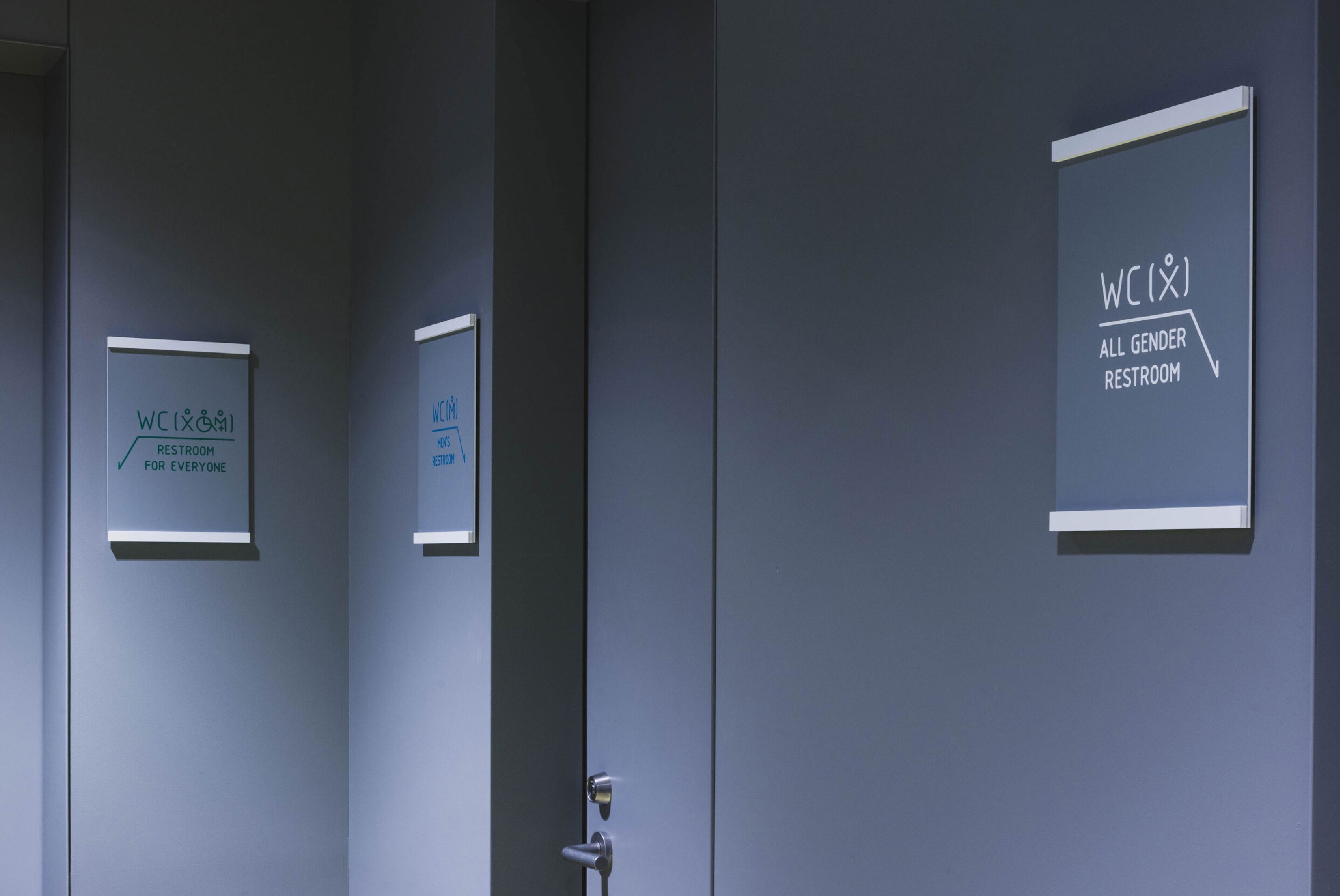 深入建筑內(nèi)部,標(biāo)識系統(tǒng)呈現(xiàn)出一種高度克制的現(xiàn)代美學(xué),每一處設(shè)計(jì)都服務(wù)于效率。樓梯區(qū)域的導(dǎo)視設(shè)計(jì)堪稱這一理念的縮影:僅使用最簡潔的直線箭頭與清晰的無襯線數(shù)字組合,摒棄了一切冗余裝飾。這種對空間效率的極致追求,貫穿于系統(tǒng)的每一個細(xì)節(jié)之中。尤為突破性的設(shè)計(jì)體現(xiàn)在地面導(dǎo)引系統(tǒng)上。項(xiàng)目徹底顛覆了傳統(tǒng)的懸掛或墻面指示牌形式,將精煉的黑色指示線與方向箭頭直接、無縫地融入地面鋪裝材質(zhì),使得科研人員在行進(jìn)過程中,視線無需刻意上抬即可輕松確認(rèn)方位與路徑。