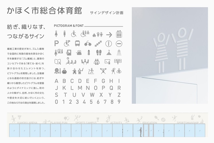 該綜合體育館標識系統(tǒng)設(shè)計,作為 2024 年日本 SDA 設(shè)計獎入選作品,以城市紡織工業(yè)歷史與建筑 “培育?編織” 的理念為核心靈感,打造出兼具功能與文化內(nèi)涵的視覺符號系統(tǒng)。該市橡膠混紡織物產(chǎn)業(yè)的獨特背景,與體育館 “聯(lián)結(jié)市民、自然與文化” 的訴求相碰撞,催生出這套既具地域辨識度又富人文溫度的標識體系。