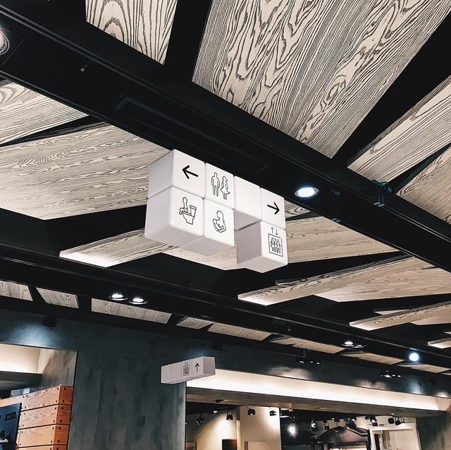 商場吊牌都采用了三聚氰胺板制成的正方體塊相組合的形式展示,多樣的組合形式讓它形式多變但風格統(tǒng)一,配合以簡潔的標識,成為裝飾它的一部分。讓它很好的融入了整個環(huán)境中,有沒有很像俄羅斯方塊!