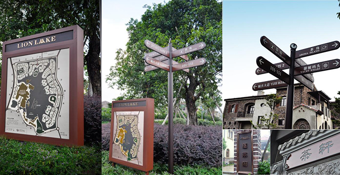 獅子湖度假村的導視設計借用阿拉伯的藝術風格,將東西文化元素進行交融,高爾夫球場的原生態(tài)地形賦予了設計更多的創(chuàng)意空間與造型元素,獅子湖公寓通過導視設計在細節(jié)中彰顯厚重感與品質感。 獅子湖集團旗下的喜來登酒店、獅子湖公寓別墅區(qū),還有高爾夫球場以及休閑會所,在整個項目規(guī)劃中各有自己獨特的布局與設計。在導視規(guī)劃中要考慮到個分項項目的內部導向,同時也要系統(tǒng)到大范圍的交通干線指引。在設計上,在保留各自設計特色風格的同時還要整體環(huán)境的統(tǒng)一。導視規(guī)劃針對各分項目的建筑特色環(huán)境,將建筑、空間、導向三者融合進來,以系統(tǒng)規(guī)劃先行,將整體的導視系統(tǒng)規(guī)范化、清晰化、系統(tǒng)化。