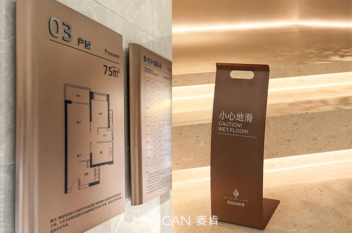 麥肯標(biāo)識導(dǎo)視系統(tǒng)山水間流動的標(biāo)識設(shè)計,如山河般錦繡如畫,通過對金屬材料的銑刻,如標(biāo)識信息從頑石、流水間劃過,進(jìn)入住宅群,還原純凈的心境,讓山河里成為獲得平靜的修心住所,在這里,草木皆是流動性,風(fēng)撫動著綠意。
